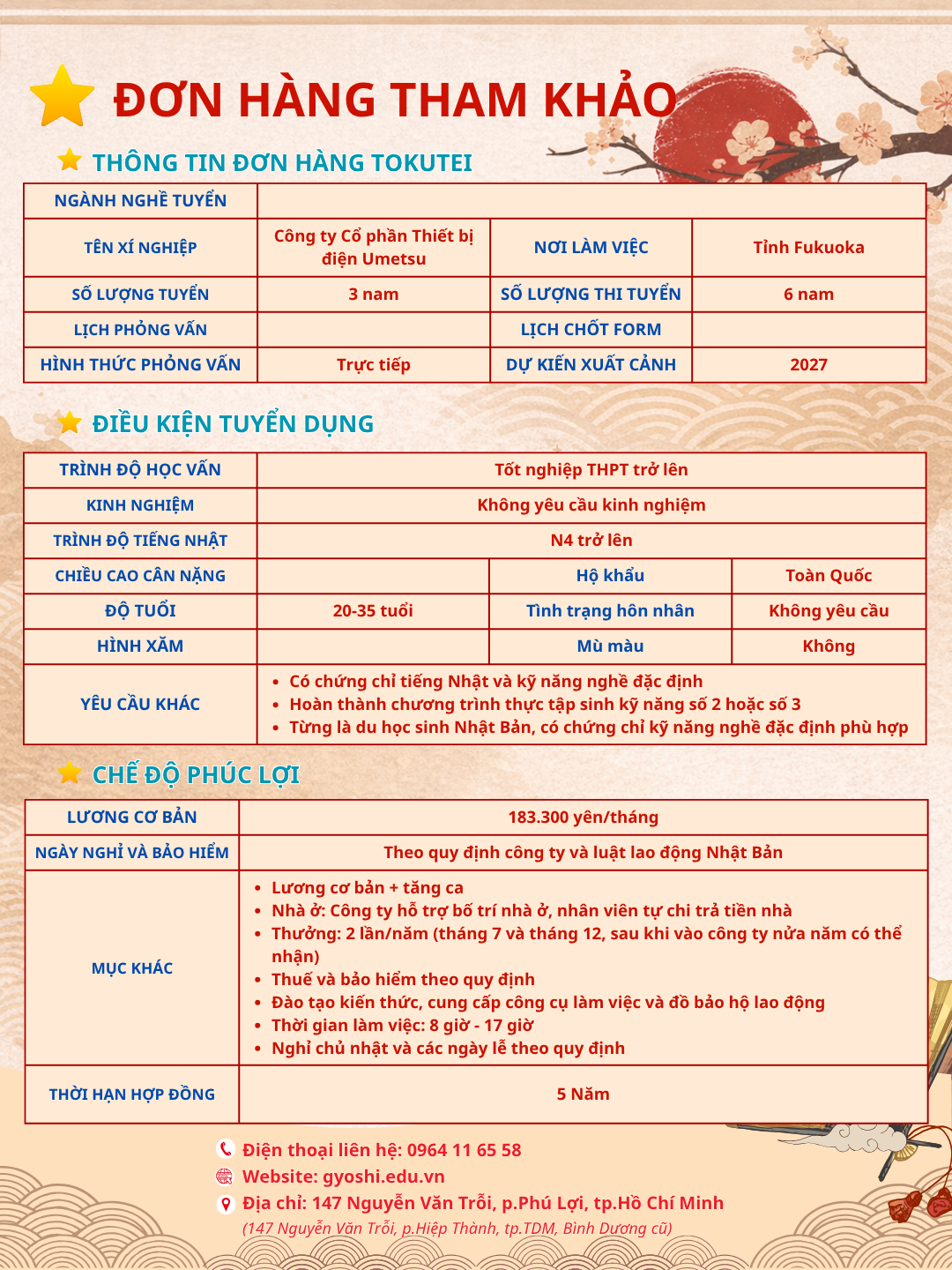 Về chế độ đãi ngộ, công ty hỗ trợ bố trí chỗ ở cho nhân viên (người lao động tự chi trả tiền nhà), đảm bảo điều kiện sinh hoạt ổn định. Ngoài ra, người lao động còn được nhận thưởng 2 lần mỗi năm (vào tháng 7 và tháng 12) sau khi làm việc đủ 6 tháng. Các khoản thuế và bảo hiểm được thực hiện đầy đủ theo quy định của Nhật Bản.